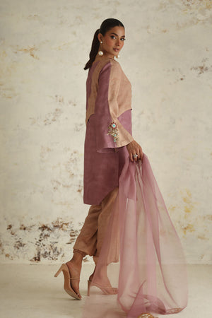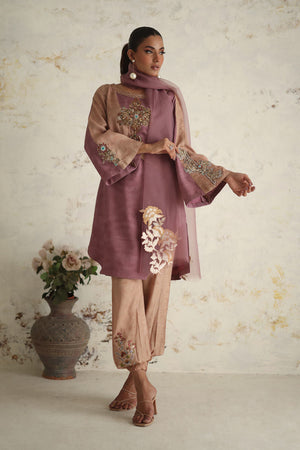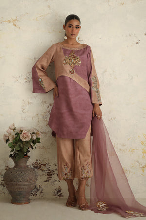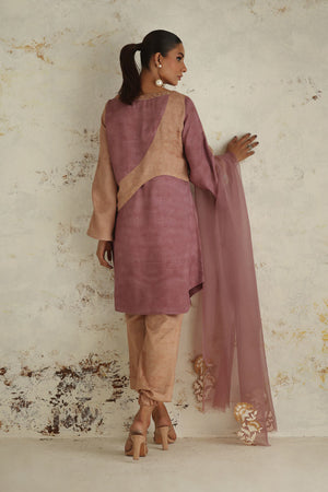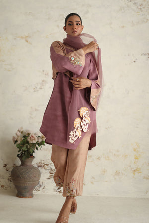 Indulge in the charm of this coffee and tea pink ensemble, featuring an A-line silhouette that exudes feminine allure. Detailed embroidery adorns the sleeves and front, adding a touch of elegance to the ensemble. Jogger pants accentuated by embroidery on hem, enhancing the overall look with a hint of flair.You can complete the look with a dupatta crafted from organza fabric, adorned with bunches along the hem, this ensemble exudes sophistication and elevates your style to new heights.