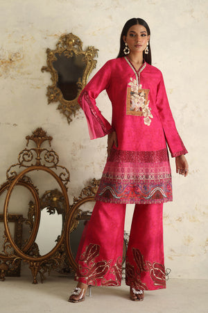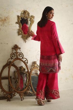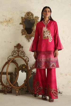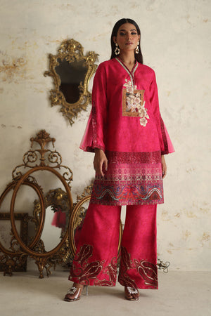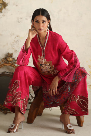 Simple yet sophisticated, this textured pink canvas, subtly adorned with hints of print, transitions effortlessly from daytime to evening soirees. The double-layered silhouette of the shirt, featuring floral embroidery and appliqué details, elevates it to a stunning ensemble that promises to leave a lasting impression.Comes with a Pant.