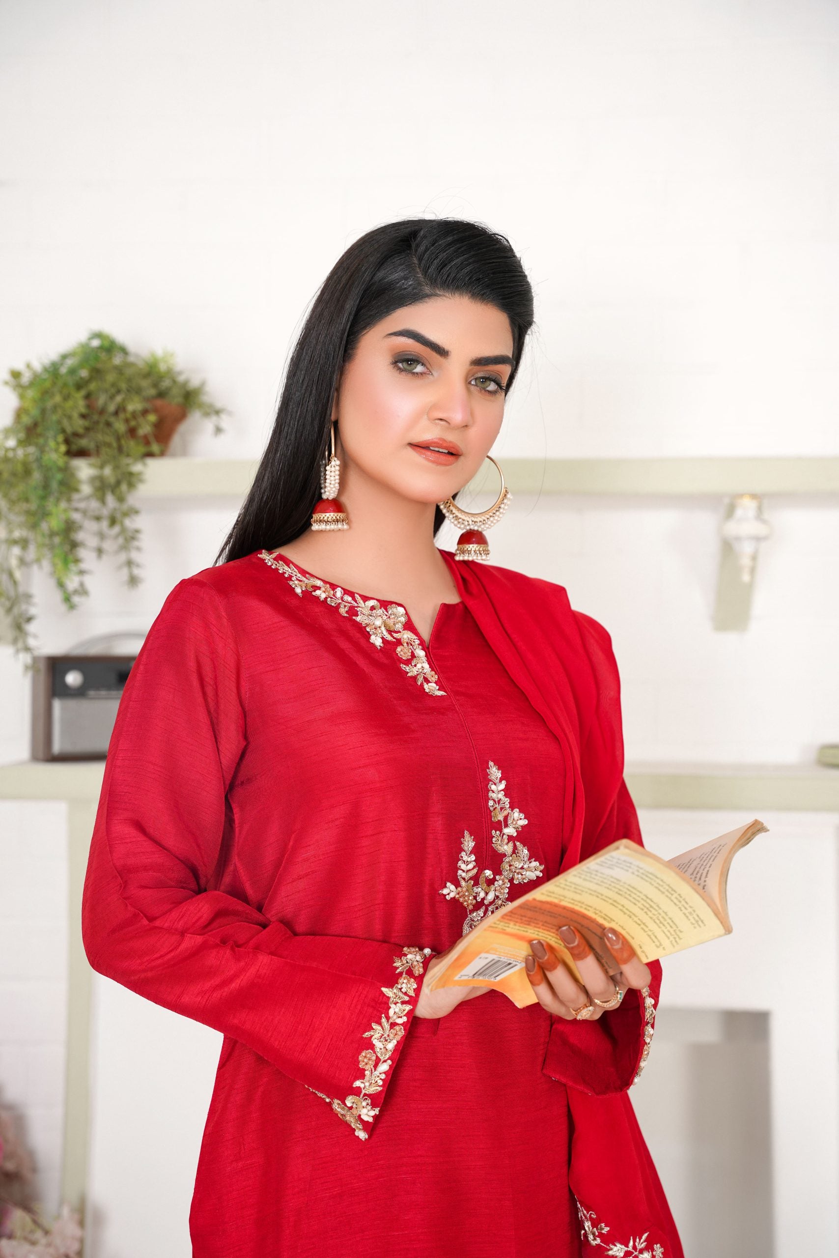 Sumptuously adorned neckline and sleeves using dabka, pearls and sequins over a sirocco colored canvas is an ethereal attire accompanied by silk dupatta and trousers.