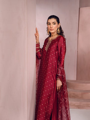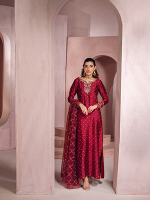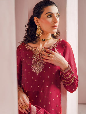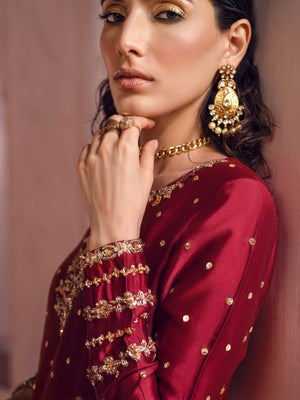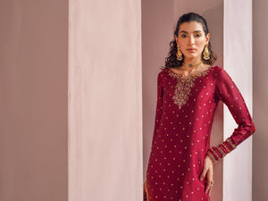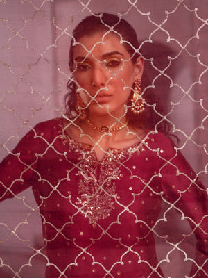A GLAMOUROUS MAROON SILK TISSUE KAFTAAN SHIRT WITH INTRICATE HAND WORK DETAILS AROUND THE NECK AND SLEEVES. THE OUTFUT HAS CHUN ALL OVER. IT IS PAIRED WITH A GLITZY ORGANZA JAAL DUPATTA.