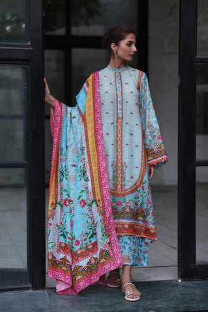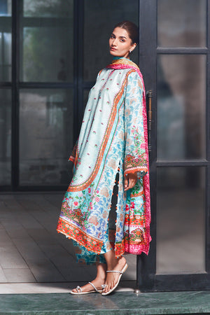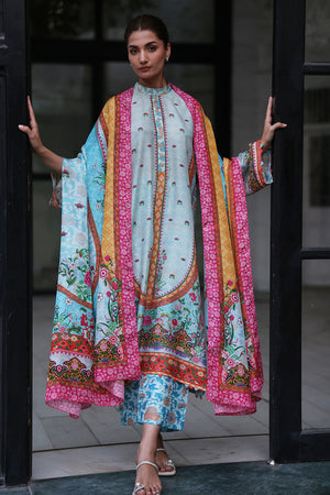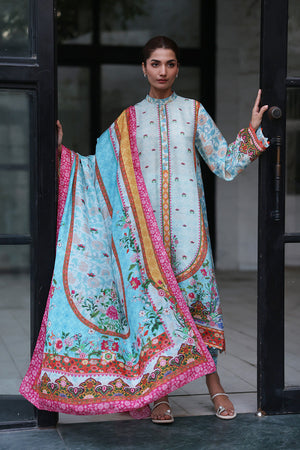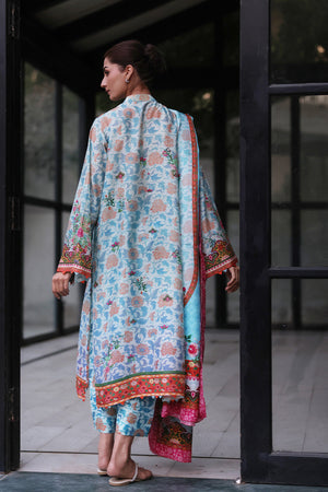 A resplendent ensemble, this luminous pure rawsilk shirt displays intricate floral and geometric prints in vibrant hues of sky blue and tangerine. Elegant silhouette is elevated with subtle hand embellishment. Complemented by a bold tangerine and sky blue painterly printed medium silk dupatta with hot pink accents. A relaxed silhouette is paired with matching painterly printed pure rawsilk culottes, making an elegant statement.