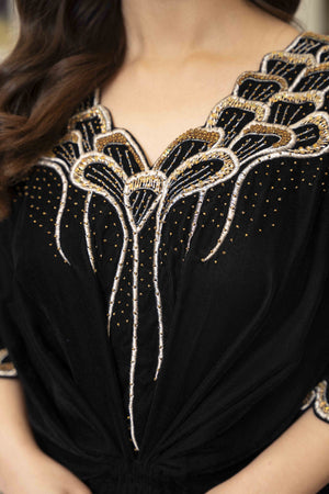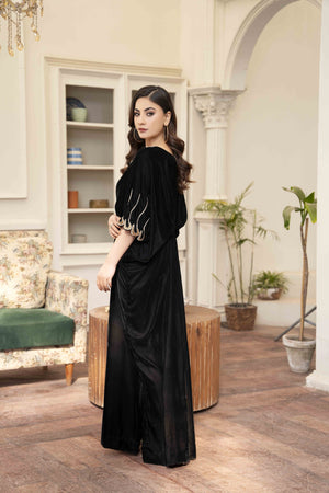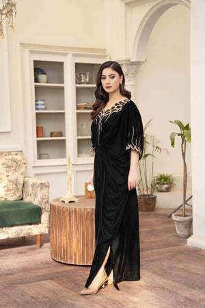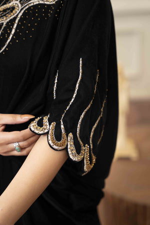 A mesmerizing black velvet kaftan is opulently curative with naqshi, dabka and embroidery and cutwork at neckline and sleeves.