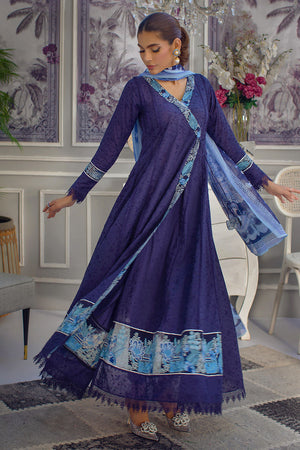This navy blue angrakha features exquisitely embroidered borders that elevate the design to new heights of opulence and grandeur. Paired with a printed iced blue dupatta, this ensemble exudes a sense of regal elegance and sophistication. Straight pants complete the look. This ensemble is perfect for those seeking a statement piece that blends traditional design elements with contemporary flair.
