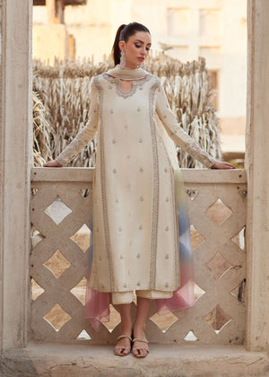 An elegant off-white ensemble crafted from luxurious pure raw silk, radiating sophistication and refinement. The long, straight shirt showcases a prominent, heavily embroidered neckline and fully detailed sleeves, with front panels enhanced by intricate lace insertions, delicate embroidery, and embroidered sprays, executed through a meticulous blend of hand and machine embroidery. The set includes tailored straight trousers accented with a complementary lace finish near the hem, while the dupatta completes the look with a subtle gradient dye effect on the pallu, adorned with delicate hand embellishments, edging, and embroidered sprays, offering an exquisitely polished ensemble for formal occasions.