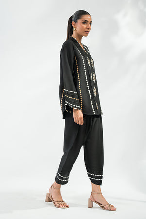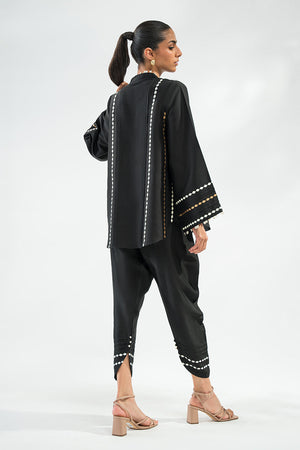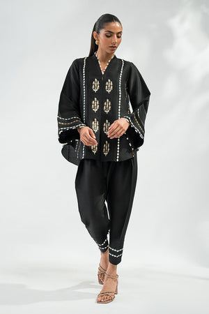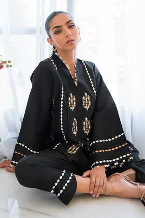 'A rawsilk box cut ebony kurta is adorned with block print and fabric manipulated accents. Featuring pleated details on the sleeves, the kurta is paired with a matching tapered shalwar.