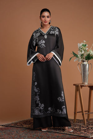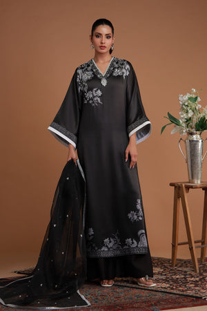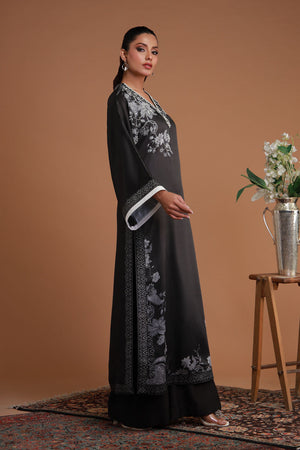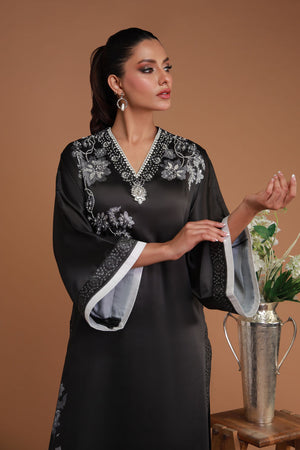This stunning kaftan is the epitome of elegance and sophistication. The delicate white Chinese flower print, with its graceful petals and stems, creates a serene, artistic effect across the fabric. The true highlight is the exquisite white pearl handwork, where shimmering pearls are carefully stitched into intricate patterns, adding a layer of luxury and refinement. The pearls are strategically placed along the neck and sleeves, offering subtle yet captivating accents. The crisp white finish on the sleeves enhances the design’s flow and movement. A perfect blend of traditional craftsmanship and modern glamour, this kaftan is ideal for formal events or weddings.