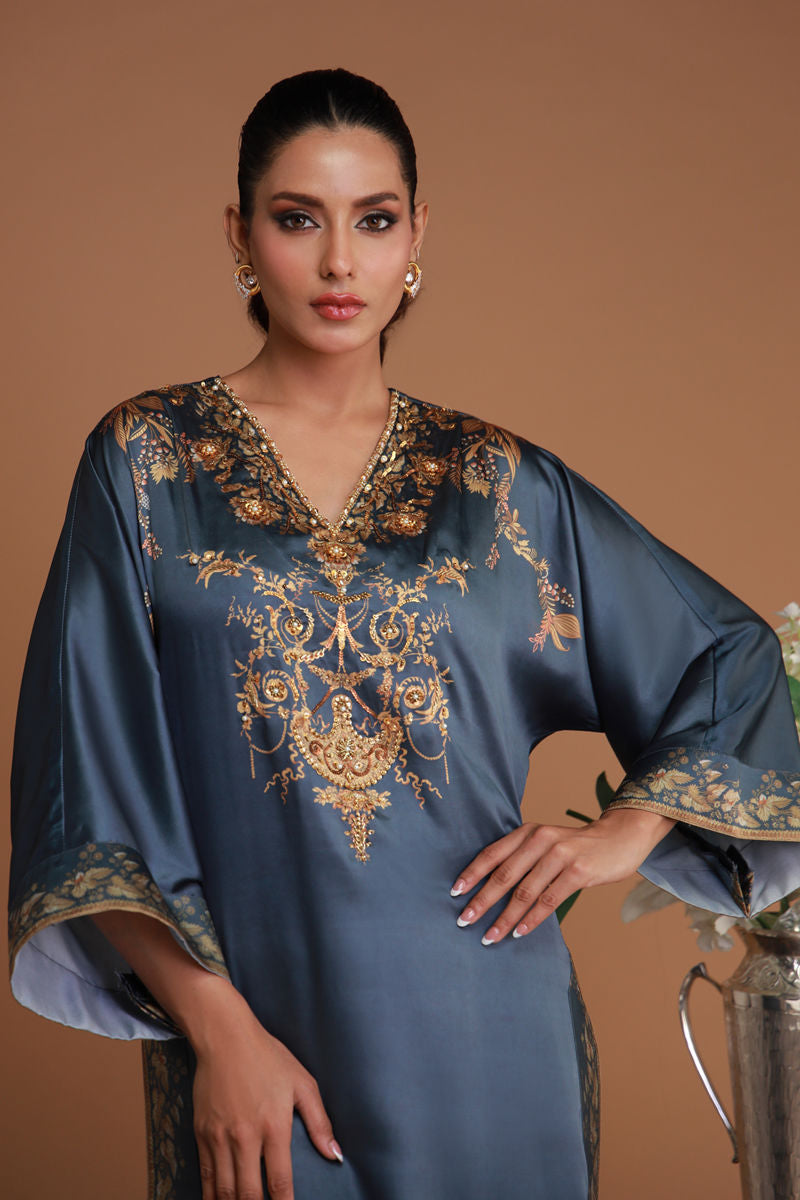 This exquisite kaftan blends opulence with elegance, featuring an intricate Baroque print on the neck, sleeves, and hem. Delicate florals, scrolling vines, and ornate patterns evoke a sense of timeless grandeur. Handcrafted details add depth and romance, enhancing the luxurious appeal. The ensemble is completed with a matching dupatta, whose flowing edges and subtle textures create a refined, harmonious look. A perfect fusion of traditional craftsmanship and modern luxury, this kaftan is ideal for formal events, weddings, or special occasions.