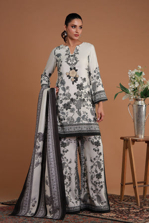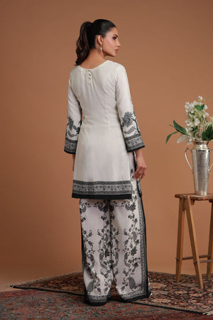 This white and black printed cord set is a bold fusion of modern style and traditional craftsmanship. The striking graphic print creates a dramatic visual impact, while machine embroidery adds a touch of luxury and texture. The intricate embroidery contrasts beautifully with the crisp monochrome design, enhancing its elegance. The streamlined silhouette makes it ideal for formal events, weddings, or special occasions. A complementing dupatta with subtle patterns and flowing edges completes the ensemble, adding grace and refinement. This chic set is a perfect balance of contemporary fashion and classic artistry.