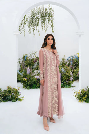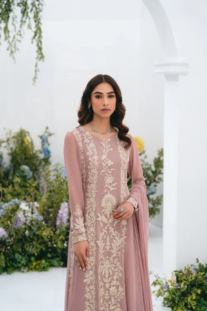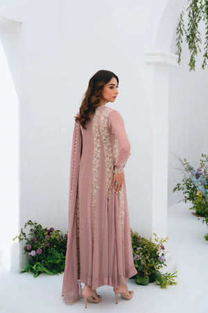 Turn heads at any musical event for the season with this vibrant ensemble. This subtly sophisticated chai-pink kalidaar features signature embroidery and handwork. The ensemble is paired with a laced-up chiffon dupatta.