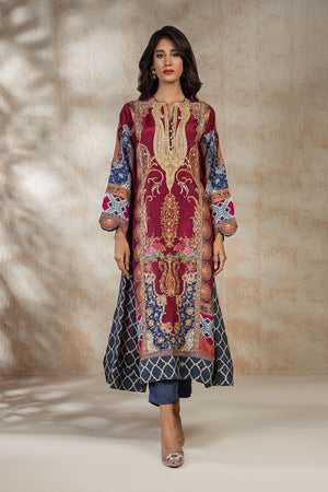 The print is enhanced with golden tila outline and zardozi work