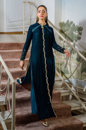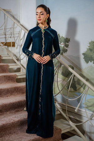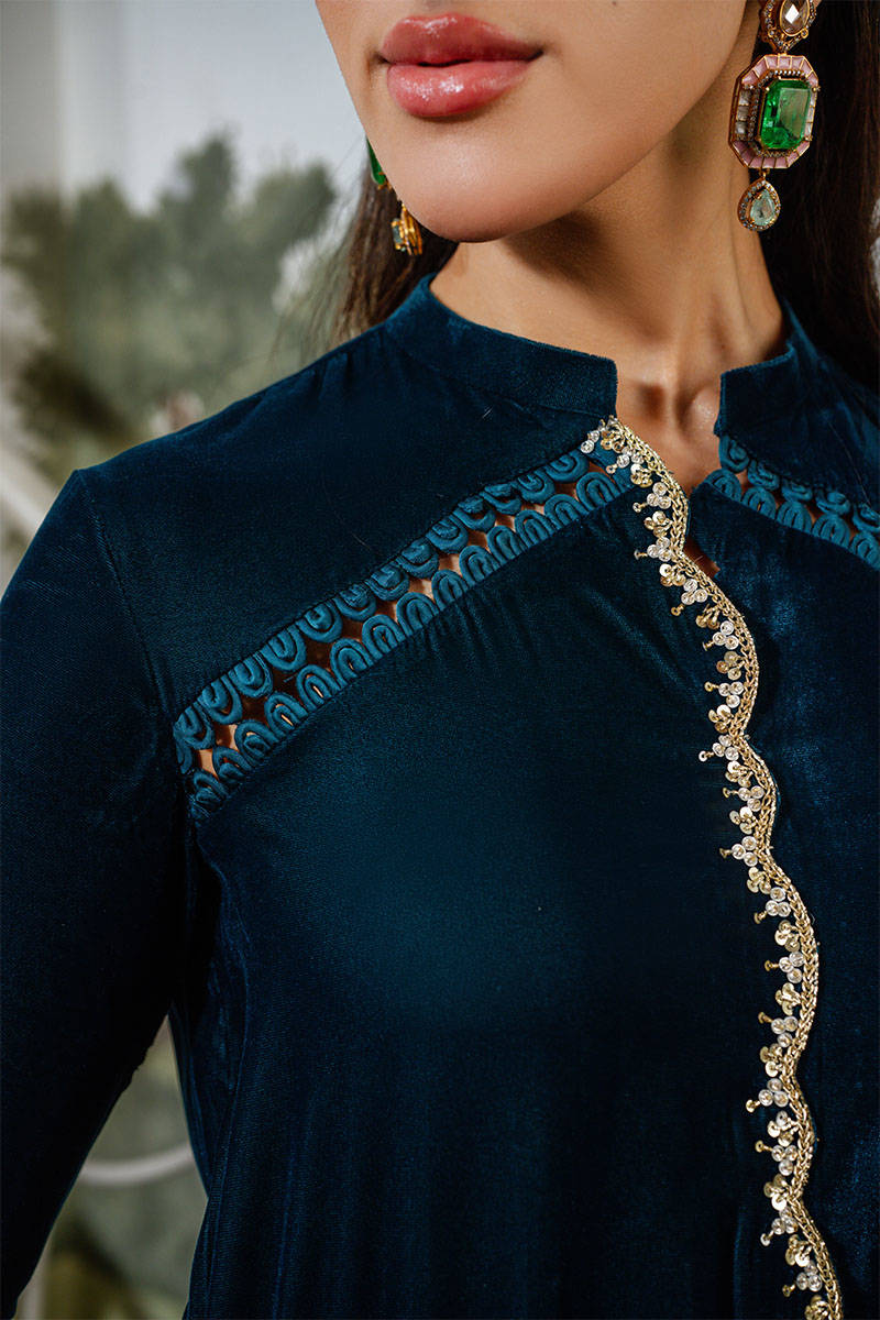 Rich Green is a striking ensemble in a stunning teal hue, adorned with intricate hand embellishments along the neckline and throughout the center of the shirt.The fitted sleeves feature crystal work and delicate hanging details that elevate the look, complemented by elegant loop accents on the neck. Paired with matching silk pants, this ensemble exudes sleek sophistication, a true head-turner for any occasion.