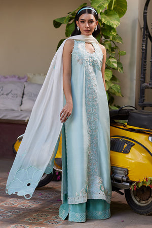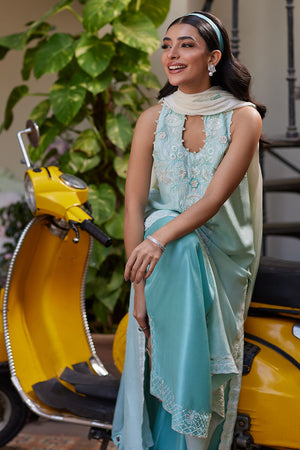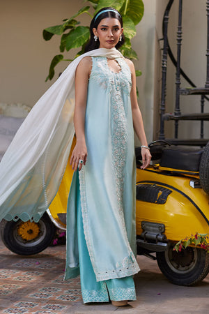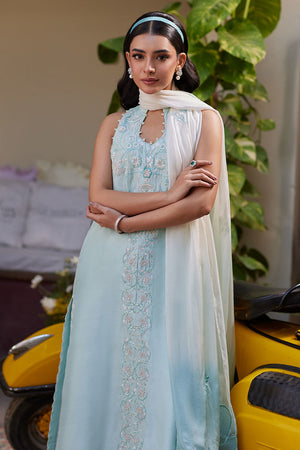 Rihanna exudes effortless elegance in this pure raw silk halter neck ice blue top, adorned with intricate monochrome appliqué and delicate 3D floral embroidery along the hem. Paired with chic slit palazzo pants and a medium silk ombré dupatta.