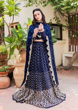 A scintillating midnight blue lehnga choli set, richly embroidered fabric featuring glistening work paired with a delicately sprayed dupatta with scalloped around the edges using embroidery. It comes with a chatta patti potli bag.