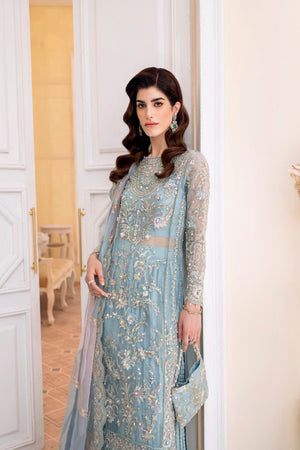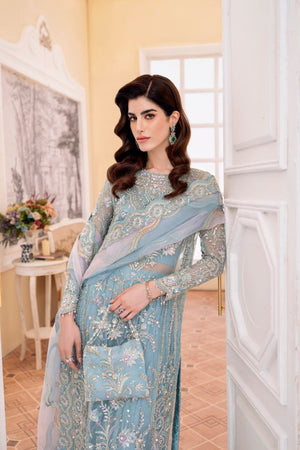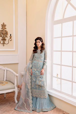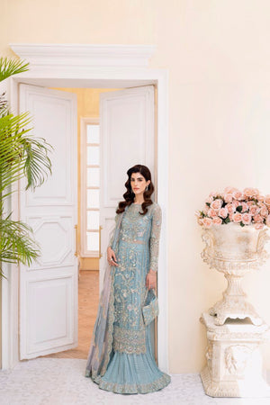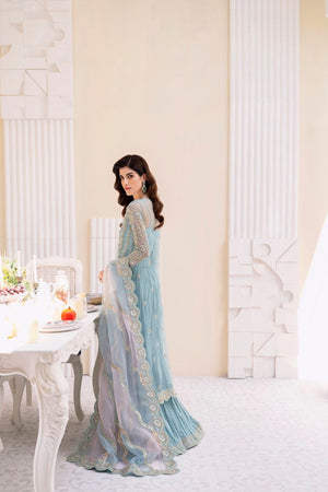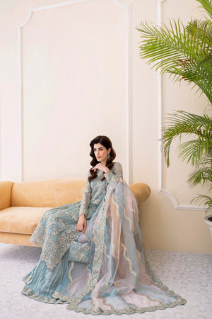 Bahira, which is created in a luxurious nude colour and exquisitely embroidered with crystal, pearls, sequins, and panni work on the borders, adds an opulent touch to your celebrations. The organza jacket features shimmering, intricate tassels and monochromatic hues of green, pink, gold, and silver. It includes a dupatta pallu that is heavily embroidered. The Azaar trousers make this outfit ideal for any occasion.