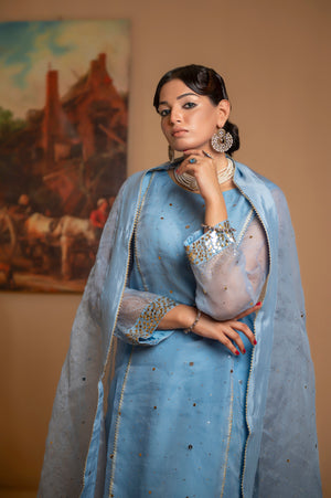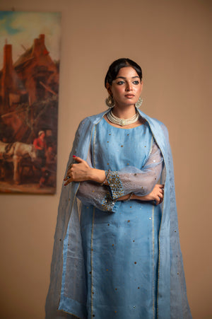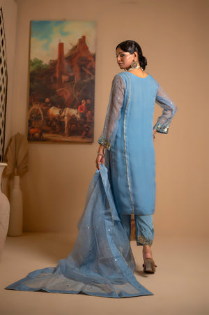Step into elegance with "Rimjhim", a stunning ensemble featuring pure mukaish embroidery on a pure organza shirt and dupatta, paired with exquisitely embroidered Korean silk trousers. Perfect for any special occasion, this design combines tradition with modern grace.