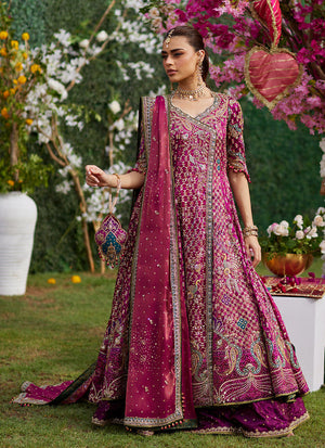 A kaleidoscope of jewel tones, with no shortage of bold details. A stunning kalidaar that we are absolutely obsessed with. The show stopping colour in a charmeuse silk, giving you the best fall as well as ample volume for that perfect twirl. The exclusively hand block printed fabric is adorned with an array of delicate hand embroidery all over. The shirt that we can’t get our eyes off, has unimaginable detailing from the ultra-flattering flared silhouette to the cut work back (that can be customized in a less revealing fashion). The sleeves with hanging tassels, intricate cutwork, hand crafted jewelled motifs make the outfit unforgettably unique. It is paired with a coordinating pink jamawar lehnga, intricately embellished to enhance the luxurious texture and complete the ensemble with graceful sophistication. A pink zarri tissue dupatta completes the look, embellished with delicate appliqué borders and refined detailing all around, adding lightness and shimmer to the outfit.