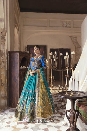 This beautiful dress, Riwayat, is a gorgeous representation of the blue summer skies. The gold embroidery with the sequined embellishments and the loose hanging tassels on the choli makes it an elegant lehenga choli outfit. Paired with a pear green tye-dyed dupatta filled with gota, sequin and dabka embellishments, and the marvelous blue hue of the lehenga choli.The shipping charges for all articles barring Bridals are as follows: