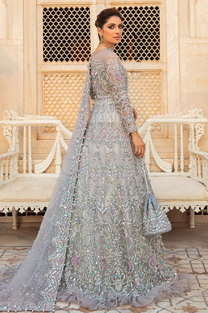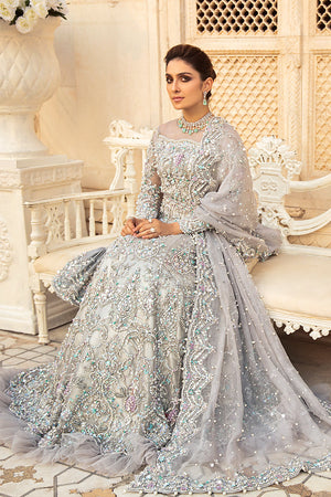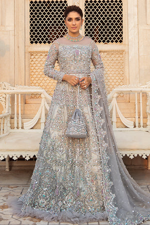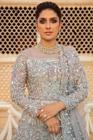 The utterly gorgeous all silver couture, is a full length organza gown with silver zardozi work with shinny crystals. It is paired with an organza dupatta with heavily worked borders and center spray of pearls.