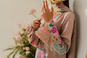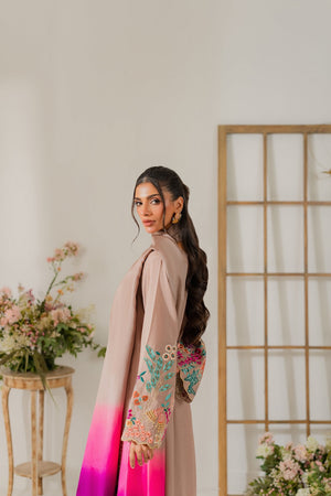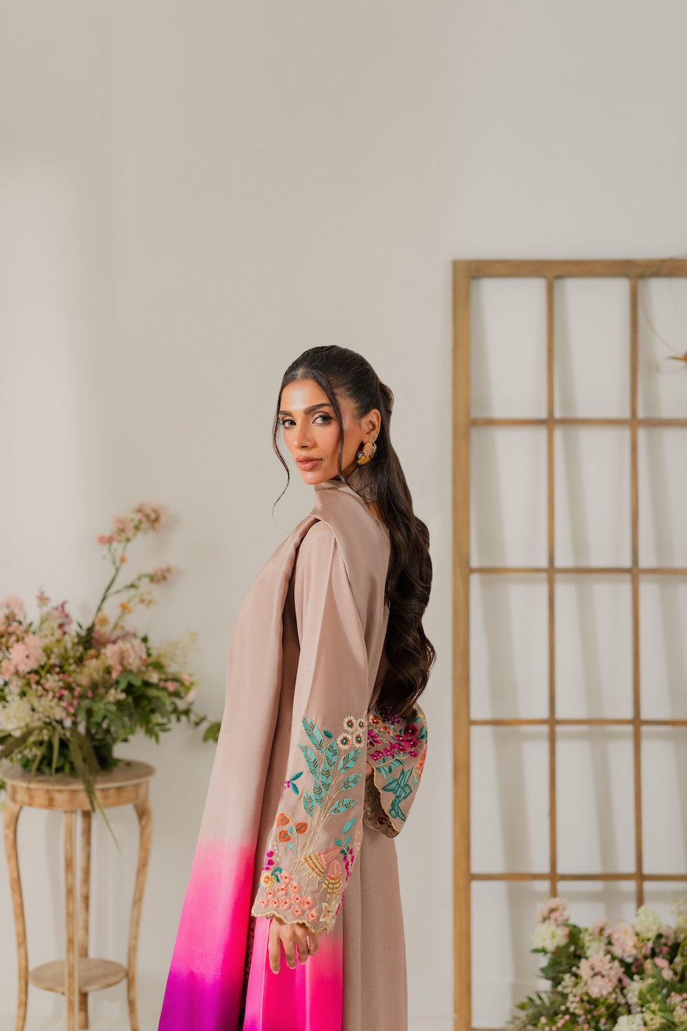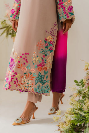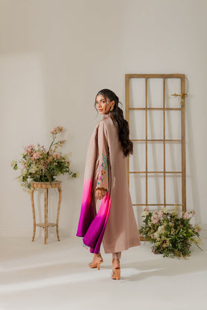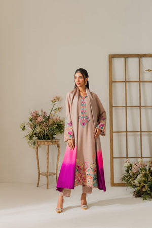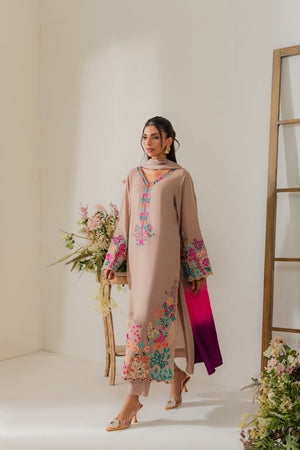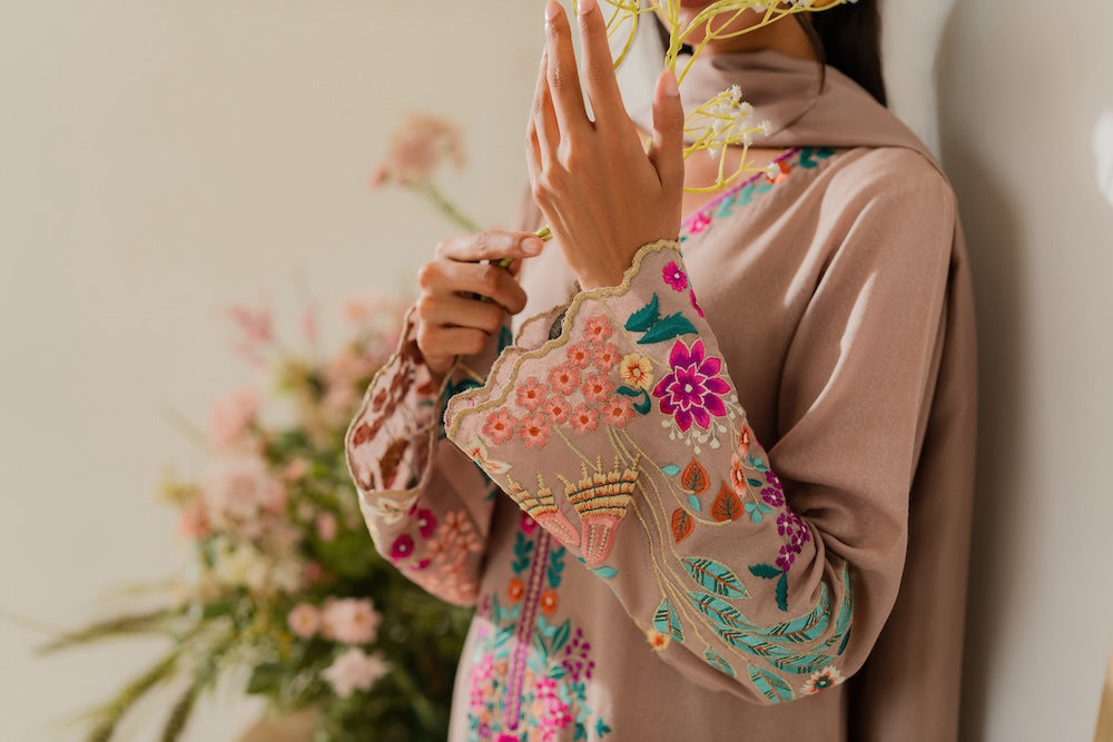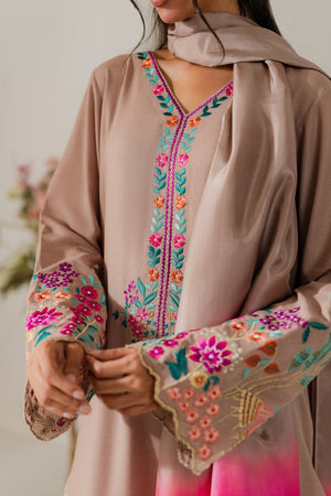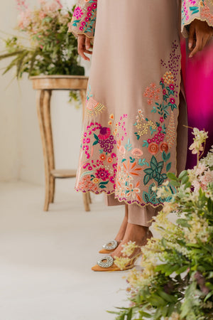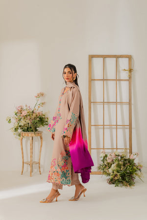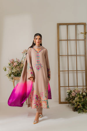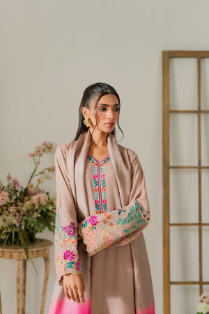 This elegant cappuccino beige two-piece karandi outfit is a beautiful fusion of subtle tones and bold detailing. The shirt is adorned with vibrant hand-machine embroidery in rich, contrasting colors, artistically placed along the daaman, sleeves, and neckline. The bold motifs bring a striking pop of color to the warm, neutral base, creating a look that’s both eye-catching and refined. Crafted in soft, textured karandi, the outfit offers a comfortable yet structured silhouette—perfect for festive or semi-formal occasions. A pure three-toned silk dupatta is available separately, adding a luxurious and polished finish to the ensemble.