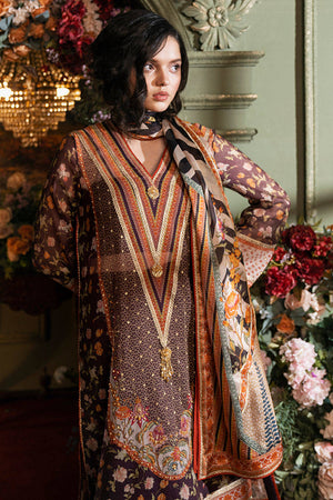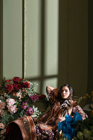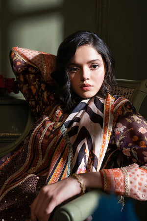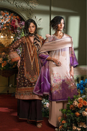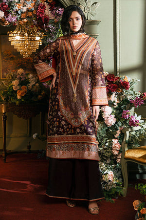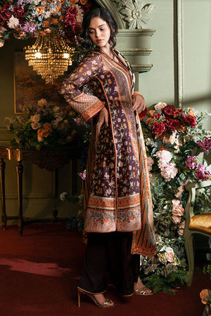 A stunning deep purple khaadi net printed long shirt with embellishment all over the shirt front paired with printed silk dupatta and completed with plain deep purple flared pants.