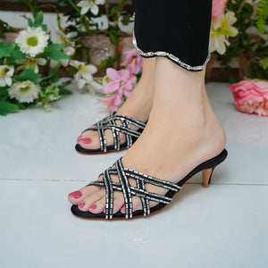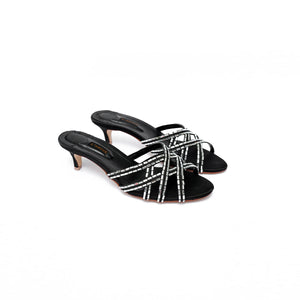 Though the design is clean and minimal with its criss-cross style, the peculiarity lies entirely in the unexpected rectangular sized crystals, which embellish the straps. In a sultry sophisticated black satin, this Roma heel is destined to become a must-have.