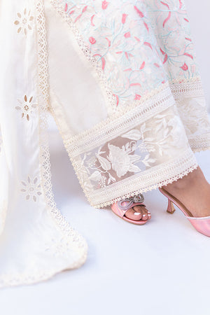 This outfit showcases Kantha stitch on pure Khadi silk, with delicate lace detailing on the panels. The neckline is enhanced with intricate handwork detailing. It is paired with medium silk dupatta and pants, creating a refined and stylish ensemble