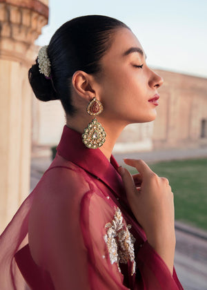 Roop, the burgundy organza jacket is a boxy cut with delicate quirky silver embellishments. The jacket is paired with korean silk camisole and korean raw silk bootcut pants .