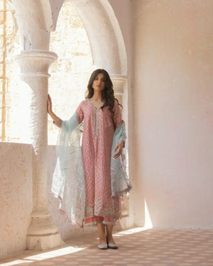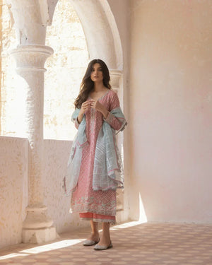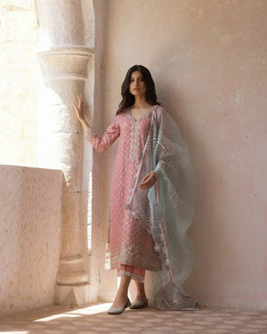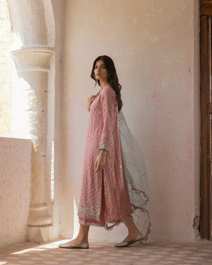 A attire in silk khadi net, resplendently adorned with intricate handwork, featuring zardosi and kamdani embellishments, for a truly enchanting and regal look.