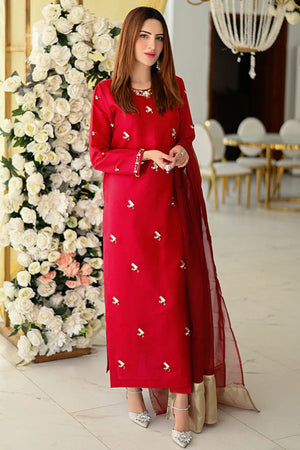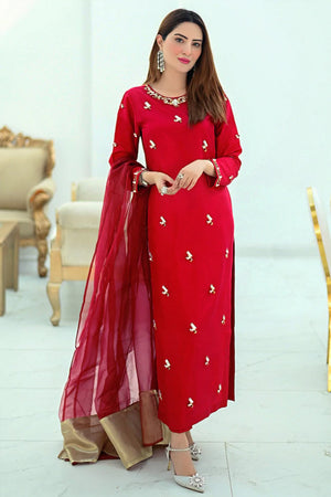 This Cherry red Silk set features ankle length, Crew Neckline donned with Stones, Pearls and beads tastefully blended with gold/silver Crystal and Sequin work. Paired with Matching Cigarette pants. Completing the look with Colour Block Organza Dupatta!The shipping charges for all articles barring Bridals are as follows: