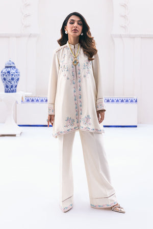 This ivory jacket is a timeless piece with a touch of elegance. The raw silk band-collar structured jacket features embroidery on the neckline, sleeves, and hem in shades of pink, blue, and white, embellished with delicate pearl details for a sophisticated look. It is paired with bootcut pants adorned with matching embroidery details, creating a cohesive and stylish ensemble.