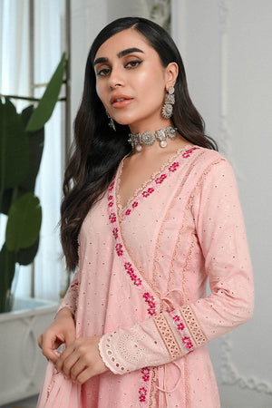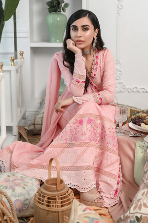 Powder pink in-house signature schiffli angrakha completed with a Schiffli border along with Gara style embroidery with sequence touching in shades of hot pink and powder pink.