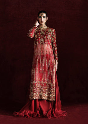 For those who love to wear bold colors, along with a striking look, “Rose” is the perfect design for you. This elegant dress features an organza base, delicately rendered floral motifs with jewel like pattern on a hue of red. The gold embellishments make the outfit very attractive and are paired with net lehnga with ruffle border.
