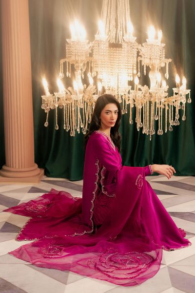 This stunning outfit features a rich magenta hue, radiating elegance with its modern design. The unique side slit scalps style offers a contemporary twist, beautifully complemented by intricate embroidery and delicate embellishments that enhance its luxurious appeal. The look is further elevated with a flowing crushed shararah, adding volume and grace to the overall silhouette. A floral organza dupatta drapes effortlessly over the ensemble, adorned with matching embellishments that catch the light, creating a soft, ethereal effect. This outfit is the perfect blend of tradition and trend.