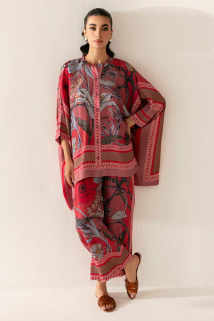 A vibrant printed red silk cord set featuring a flowy, relaxed silhouette with wide sleeves and intricate patterns. The button-down top adds structure, perfectly balanced by coordinating pants for a luxe yet comfortable look.