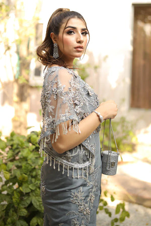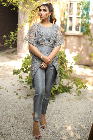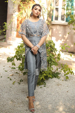 Designed in a modern cut, this gray toned open jacket is fully embellished with bleaming crystals. Comes with embellished bustier delicately with Swarovski crystals and beads. Paired with straight raw silk pantsThe shipping charges for all articles barring Bridals are as follows: