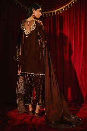 This mocha velvet ensemble exudes understated luxury with intricate zari appliqué adorned in fine zardozi handwork. It is paired with a complementing shalwar featuring gold spray sequins that add a soft shimmer. The organza dupatta, finished with velvet appliqué and delicate gota details, completes the look with a perfect balance of elegance and tradition.