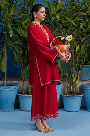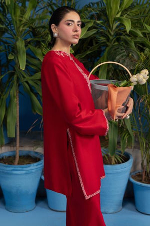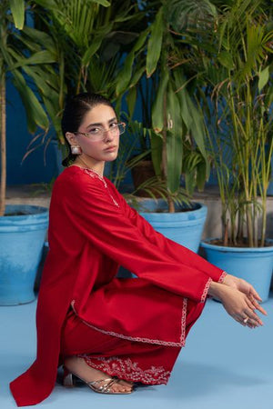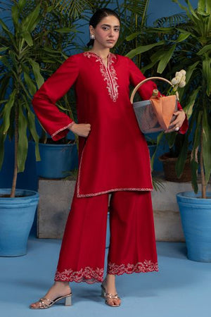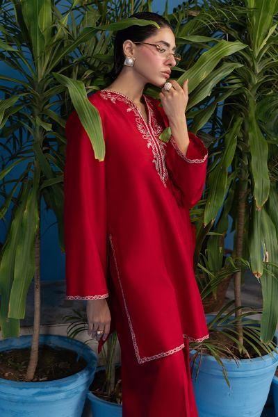 This striking ensemble in a bold red hue commands attention with its fusion of tradition and contemporary design. The short shirt, finished in a silver-dust sheen, brings a soft metallic contrast to the richness of the red base. Its neckline is crafted with a modern architectural cut—clean yet eye-catching adorned with unique, multicolored embroidery in unexpected shades, adding a playful yet elegant twist.Paired with culotte-style shalwar pants, the silhouette feels refreshingly modern. The wide-leg trousers feature complementing embroidery at the hems, echoing the neckline’s vibrant threadwork and enhancing the visual harmony of the outfit. Bold yet sophisticated, this look is perfect for someone who loves cultural roots with a fashion-forward edge.