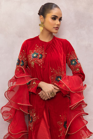 Draped in a captivating Deep Red shade, this showstopper Stylish Front Open Gown is a true statement piece. Adorned with intricate handwork featuring sequins, crystals, and cut dana, it promises to capture attention with its elegance. The gown comes complete with a silk jumpsuit, adding a modern touch to the ensemble.To enhance the overall appeal, the outfit is paired with an organza frill dopatta, embellished with golden beads, creating a perfect blend of sophistication and glamour.