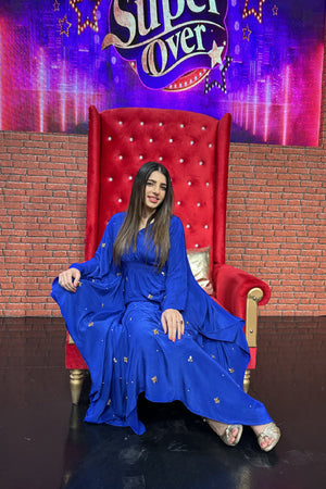 Pure silk poncho with elasticated cut in blue hues embellished with 3D hand embroidery with slanted sequins laser cut pieces, cutdaana, tilla and beads. A perfect gown with flowy cut and perfect drape.