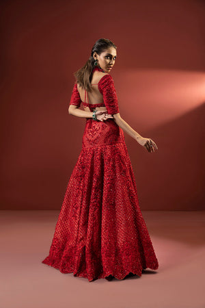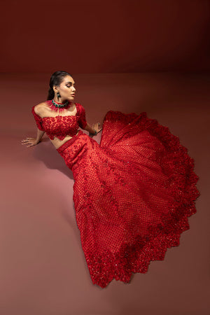 Ensemble, a testament to timeless elegance and rich cultural. This exquisite dress boasts a deep red hue reminiscent of passion and allure. The Lenhga gracefully cascades into a skirt, adorned with intricate Sequence embroidery detailing featuring a harmonious blend of floral and geometric motifs, meticulously crafted with luxurious jewellery material.The choli, adorned with Indian sleeves, complements the ensemble, exuding grace and sophistication. The stitching technique intertwines the Lenhga and choli seamlessly, embellished with a bridal vail that adds a touch of ethereal charm.