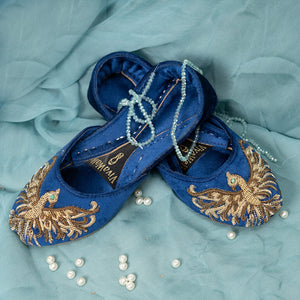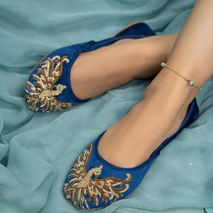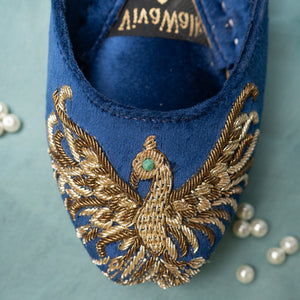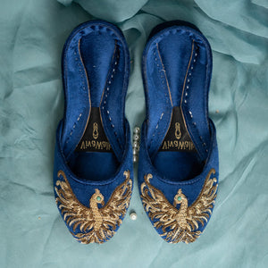 “Unleash your inner royalty with ‘Royal Phoenix’ this Eid! A luxurious royal blue velvet canvas becomes the stage for a majestic phoenix, meticulously crafted with 8 to 10 hours of handmade craftsmanship and gleaming antique gold Dabka. Its captivating crystal eye adds a touch of intrigue. The opulent details whisper of timeless elegance, while the comfortable leather sole ensures you conquer Eid in style and comfort. There’s a sweat of labor in its every stitch, a testament to the artisans’ dedication and hard work. Feel the pride and passion of those who poured their hearts into creating this masterpiece, making your celebration even more special.”'