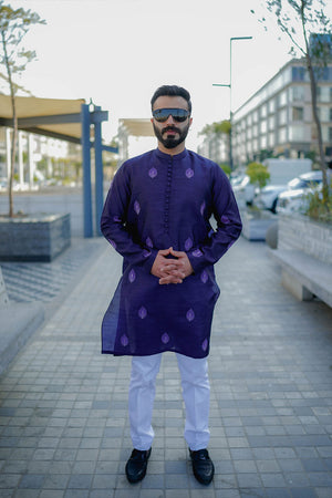 An amalgamation of India Raw Silk fabric in royal purple that is bedazzled with Resham and tilla to add more hues to your Eid festivities.
