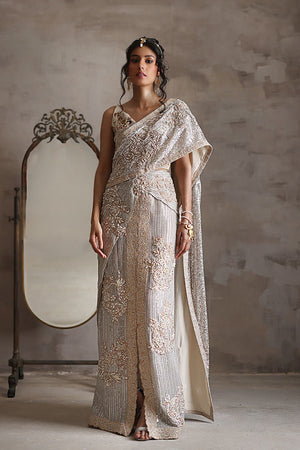 The second blouse is a vision of opulence, featuring fully handcrafted ivory moti work embellished with resham thread. Every bead and thread is woven together with precision and care, creating a symphony of texture and design that elevates the saree to new heights of elegance.
