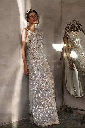 Step into a world of enchantment with this exquisite silver sequin fabric saree, a radiant embodiment of grace and glamour. Each shimmering sequin casts a spell of elegance, creating a mesmerizing backdrop for the intricate tapestry of gold, silver, and ivory machine-embroidered motifs that adorn its surface.
