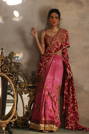 Adorned with delicate vintage floral motifs, each intricately enhanced with meticulous Zardozi work, this saree exudes an aura of regal splendor. The meticulous craftsmanship adds depth and dimension, creating a mesmerizing tapestry of tradition and contemporary finesse.