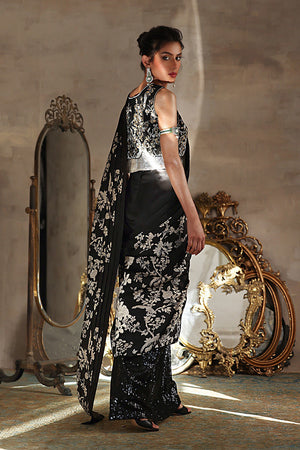 Indulge in the timeless elegance of Sheesha Silk fabric with this exquisite saree, a harmonious blend of modern allure and vintage charm. Crafted to drape gracefully, the saree embodies sophistication and femininity with its flowing texture and luxurious feel. Beautiful machine embroidered silver,black and ivory floral motifs appliqued on the font of the saree.