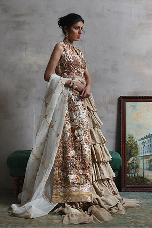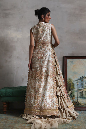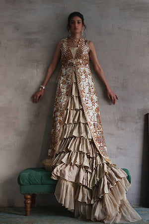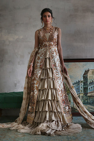 This stunning ensemble features a long front open ivory jacket crafted from sheesha fabric, adorned with an ivory textured print. The jacket is adorned with industrial machine tile embroidery throughout the print, elevated by intricate zardozi work. Completing the look is a machine embroidery lace finishing, adding a touch of elegance. It's paired with a long layered inner for a cohesive and sophisticated appearance.