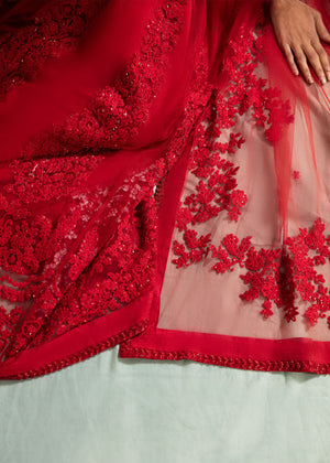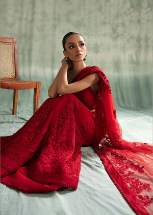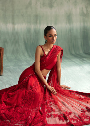 "Ruby Enchantment" saree is an absolute stunner! The deep maroon color evokes a sense of sophistication and allure. Adorned with intricately done hand embroidery, this saree is truly enchanting. The delicate detailing adds a touch of elegance, making it perfect for any special occasion.