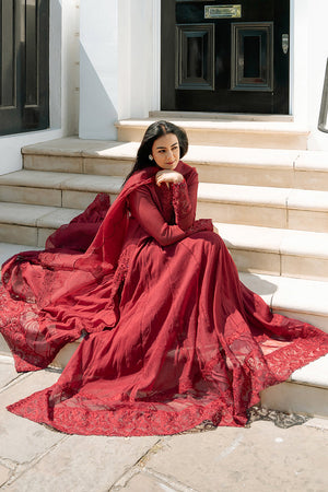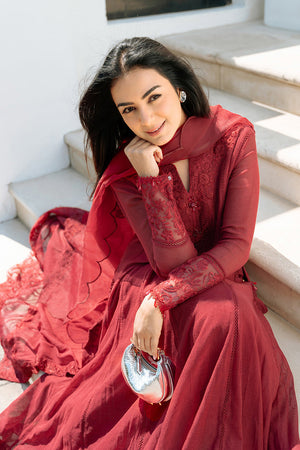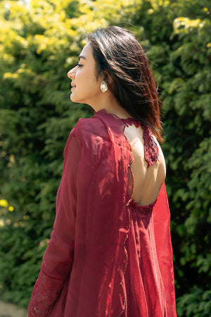 Introducing our stunning deep Red Cotton Net Pishwas from our Eid Festive Collection. This captivating ensemble showcases intricate embroidery on the neck, borders, and sleeves, adding a touch of grace. The stitching details and lace panels enhance its beauty.Paired straight rawsilk pants with embroidered scalloped border, and an organza dupatta with exquisite embroidery. Perfect for elevating your festive style.