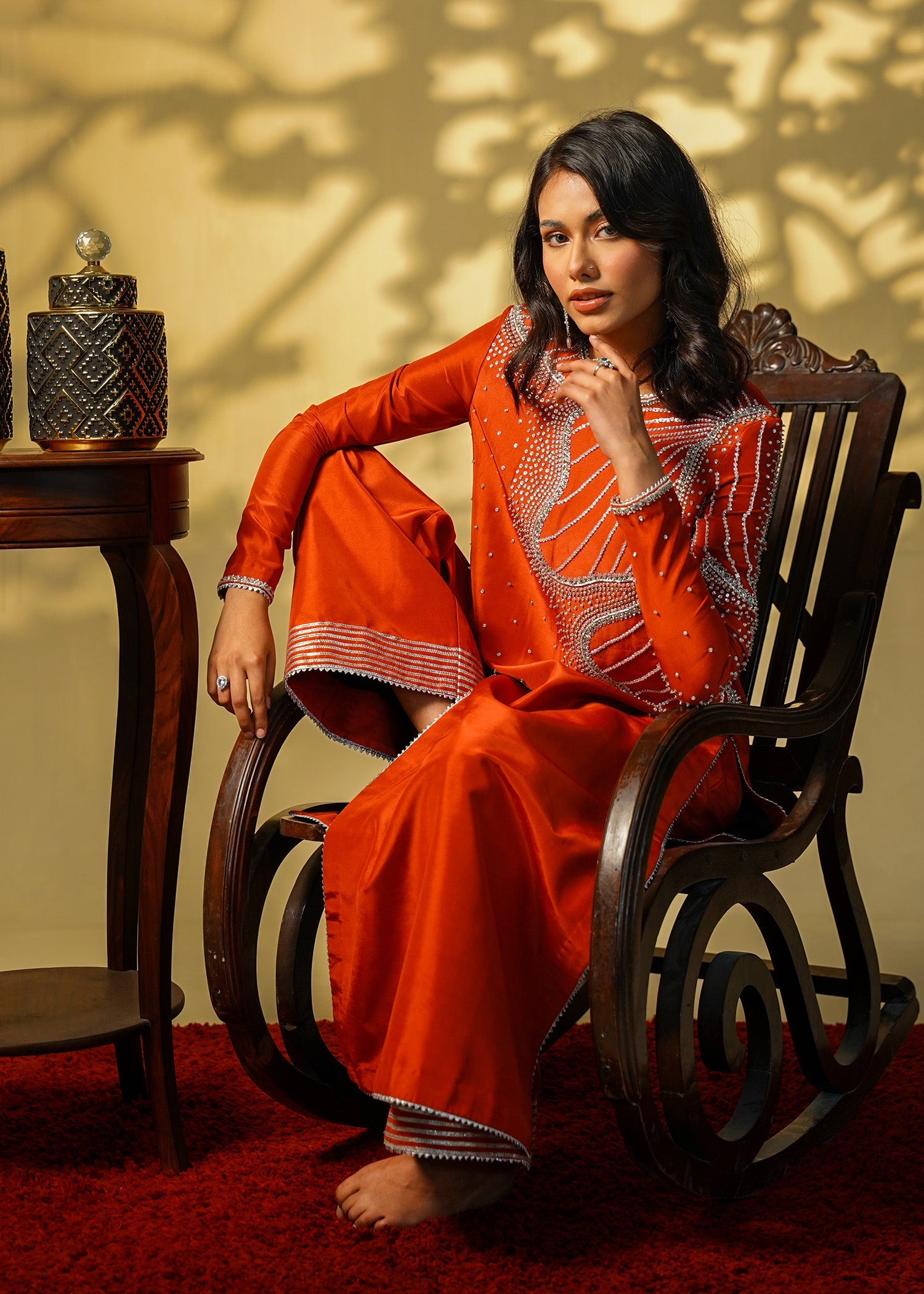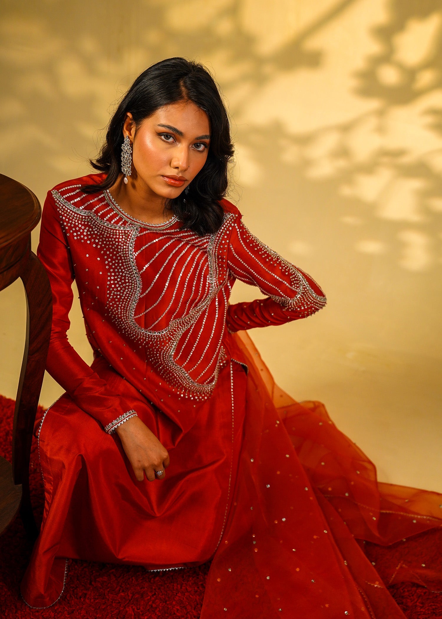 Description: Drenched in the allure of crimson fire laced with gleaming silver desire.A symphony of elegance bold yet divine Ruby Rouge—where grace and glamour entwine.
